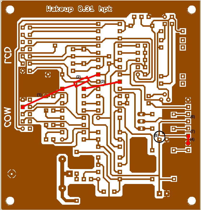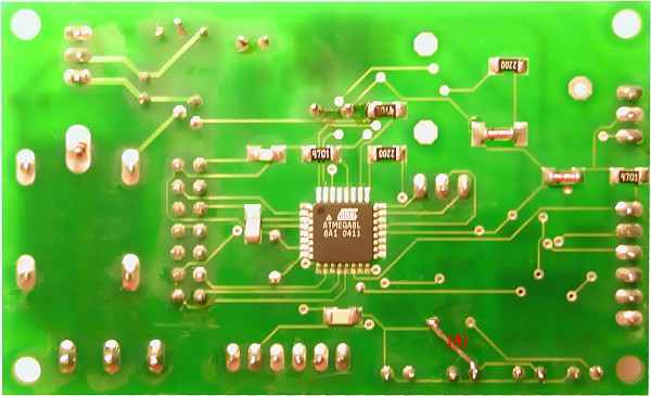 LED2 und LED3 sind standardmäßig gegen 5V geschaltet und zeigen daher den Zustand invertiert an (An bei 0V, Aus bei 5V). Meine Modifikation behebt diesen Umstand (An bei 5V, Aus bei 0V). Dazu werden die LEDs ausgelötet und umgedreht (6),(7). Dann werden die LEDs von 5V getrennt (5) und mit Masse verbunden (4).